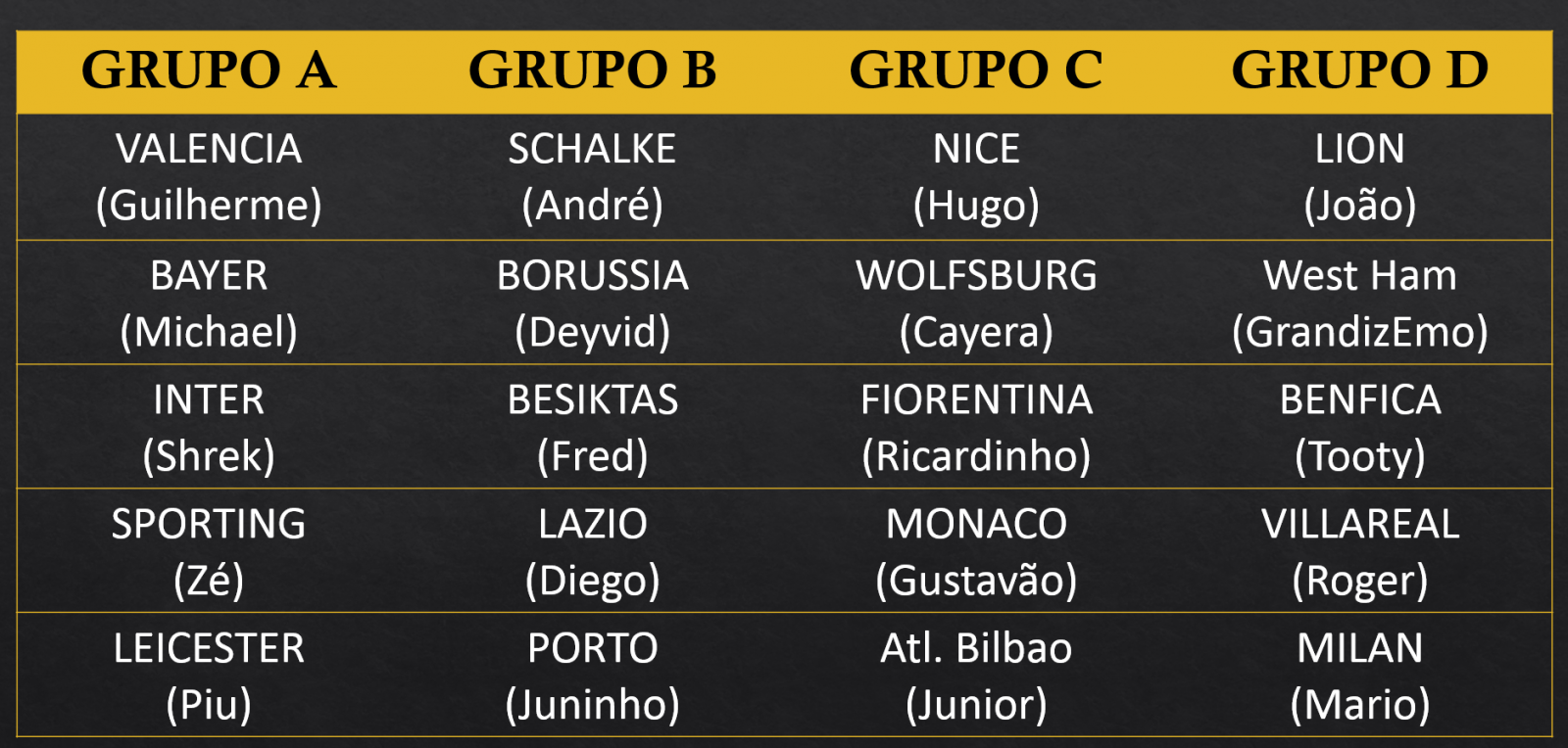 Grupos DefinidosNa última quinta-feira, a diretoria da liga fez o sorteio dos grupos, ao vivo, para o próximo campeonato. Com 20 times inscritos, a tabela será inédita, seguindo o modelo do campeonato Paulista desse ano.