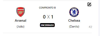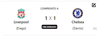 O jogo mais esperado da noite aconteceu entre os técnicos Danilo (Chelsea) e Diego (Liverpool). O jogo começou morno, com ambos os times com medo de atacar e assim foi o primeiro tempo inteiro. Já no segundo tempo, tivemos mais emoção.