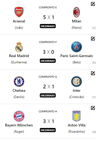 Nessa fase oito times deixaram a competição, Tottenham (Antônio), Newcastle (Bruxão), Bayer Leverkusen (Bernardo), Borussia (Vitão), Milan (Mário), PSG (Beto), Inter (Cristovão) e Aston Villa (Ricardinho).