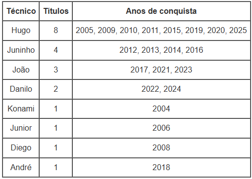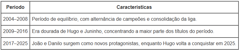 Hugo é o maior campeão da história, isolado com oito títulos. Juninho dominou o ciclo entre 2012 e 2016, enquanto João e Danilo representam a nova geração disputando o topo.