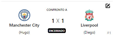 O jogo mais esperado da noite aconteceu entre os técnicos Danilo (Chelsea) e Diego (Liverpool). O jogo começou morno, com ambos os times com medo de atacar e assim foi o primeiro tempo inteiro. Já no segundo tempo, tivemos mais emoção.