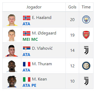 A artilharia do tornei ficou com o técnico Hugo, a frente do Man. City, seu atacante E. Haaland anotou 20 gols e por um ficou a frente de M. Odegaard, jogador do Arsenal e do técnico João.