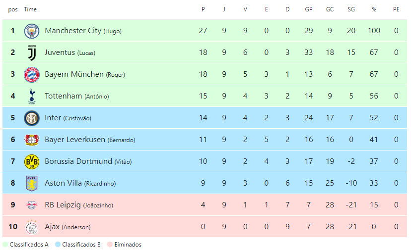 Ao final da primeira fase 4 times ficaram de fora, sendo eles Barcelona (Tooty), Man. United (Cayera), RB. Leipzig (Joãozinho) e Ajax (Anderson). Destaque para o Man. City, do técnico Hugo, que consegui 100% de aproveitamento nessa fase.